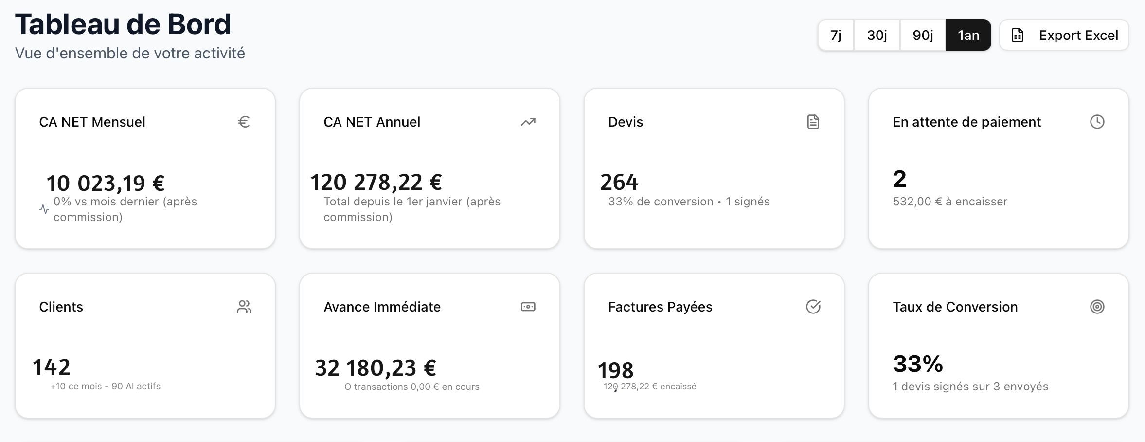Suivez votre chiffre d’affaires, vos prestations, vos paiements et l’évolution de vos indicateurs clés en un clin d’œil.