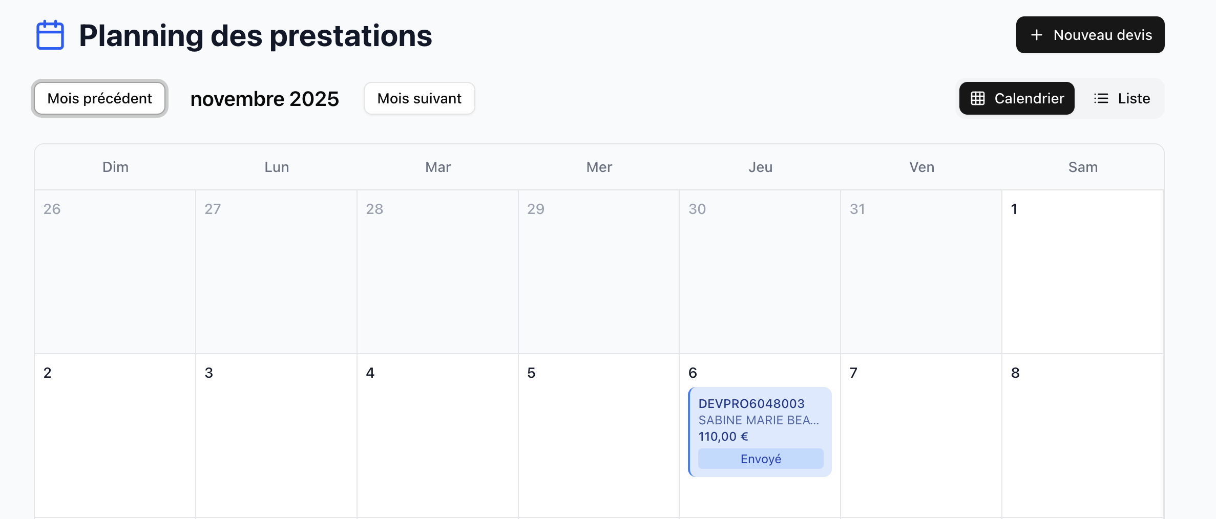 Coorie centralise vos prestations dans un calendrier intelligent, synchronisé avec vos clients et vos documents administratifs.