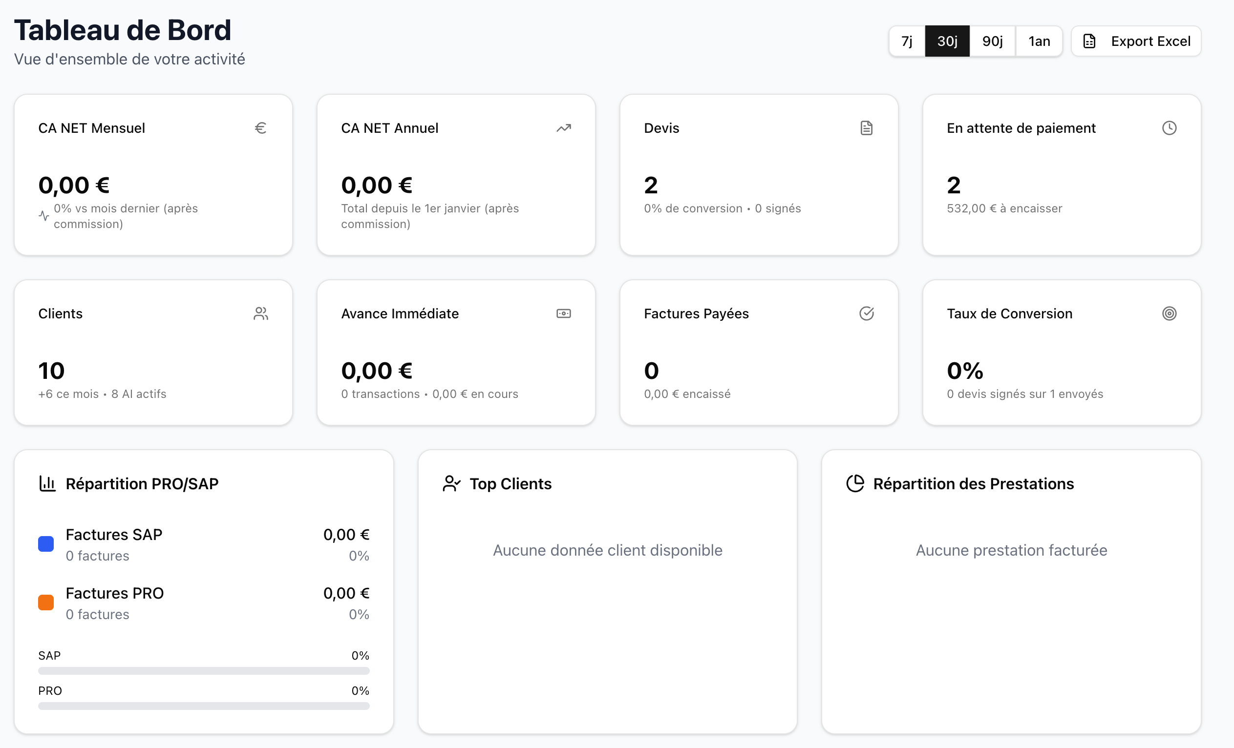 Visualisez en temps réel l’ensemble de vos indicateurs clés : chiffre d’affaires, factures émises, paiements reçus, taux de conversion et répartition de vos prestations.